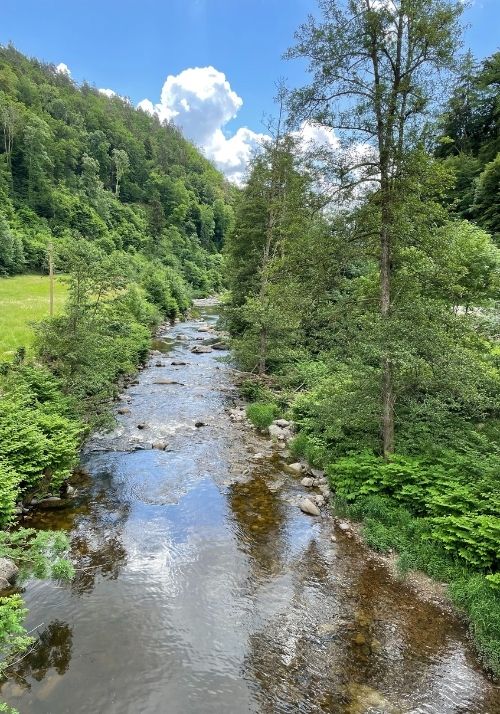 Der Startpunkt der insgesamt 83,8 km langen Wanderroute bildet Albbruck am Hochrhein. Von hier aus geht’s auf dem überlebensgroßen Albsteig-Portal des Bahnhofs in Albbruck am Rand der beeindruckend tiefen Albschlucht hoch nach Schachen. Von dort aus habt ihr eine super Aussicht über das Rheintal bis hin zur Schweiz. Außerdem gibt es hier einen Trinkbrunnen, um eure Flaschen nochmal aufzufüllen.