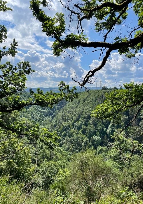 Auf einem schmalen Pfad durchquert ihr die Albschlucht auf dem Studinger Steg. Der gegenüberliegende Wanderweg führt euch direkt hoch über der Alb. Währenddessen können immer wieder schöne Ausblicke ins Tal genossen werden, z. B. von der Peterskanzel aus. Wenn ihr in Tiefenstein angekommen seid, wird die Alb wieder überquert. Während ihr den Ort durchquert habt, führt ein schattiger Waldweg zum Aussichtspunkt Kaibenfelsen. An diesem vorbei, geht es dann in Richtung Höllbach.