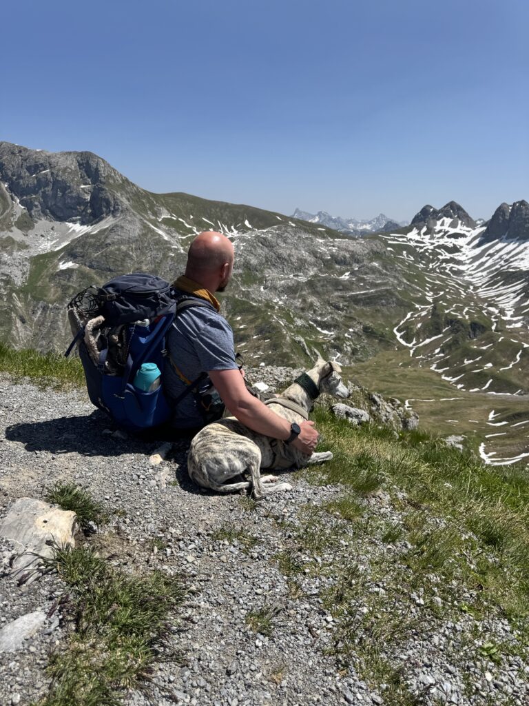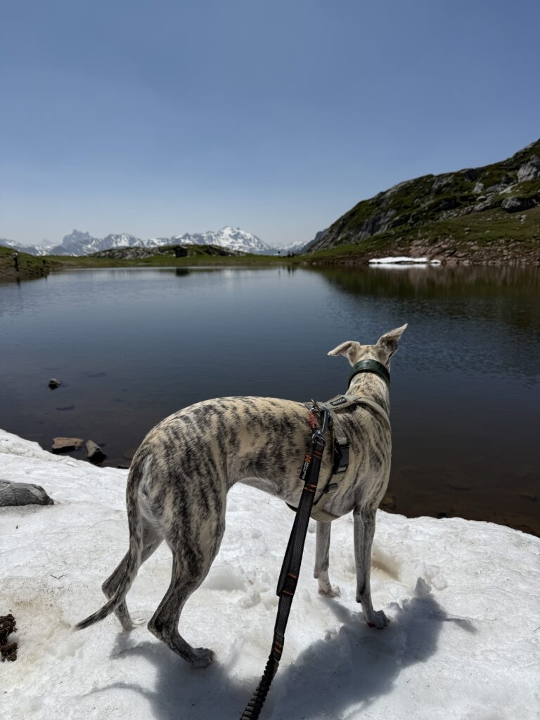Von Lech am Arlberg ging es mit der Rüfikopf-Seilbahn (Maulkorb nicht vergessen!) entspannt hinauf auf 2.350 Meter. Oben angekommen: Frische Bergluft, Weite und – kaum zu glauben – Schneefelder mitten im Juni! Für Sonic und Asta war das das Paradies. Sie haben es sichtlich genossen, durch den kühlen Schnee zu tapsen, Ausschau zu halten und einfach „Hund zu sein“.