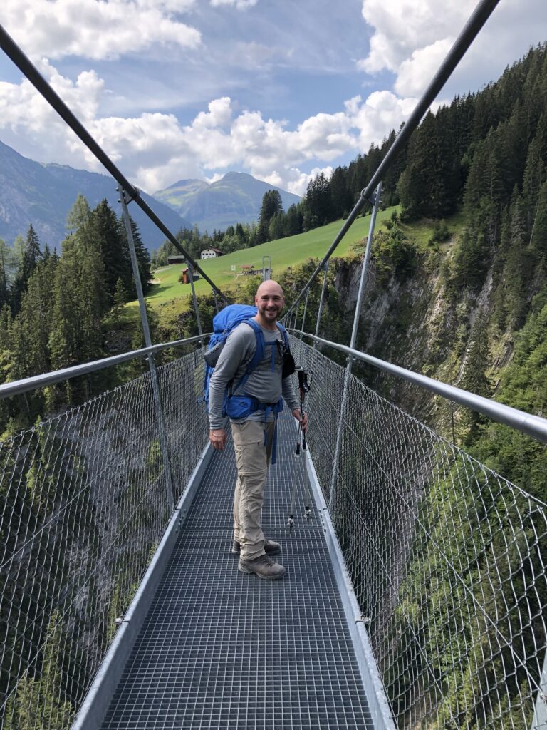 Der Rückweg & die Mutprobe: Frisch gestärkt folgten wir dem E5 zurück, vorbei an beeindruckenden Wasserfällen bis zur berühmten Hängebrücke in Holzgau. 2018 bin ich noch locker drüber spaziert, aber diesmal hatte ich ehrlich gesagt weiche Knie.